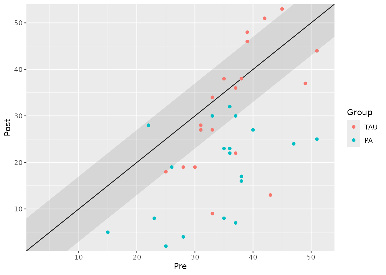 #> TAU | PA | -10.23 | -18.28 | -2.75 | 0.95 | 19 | 21 | Probably clinically significant effectThe analysis shows a “Probably clinically significant effect” in favor of the PA group. The average difference between the groups exceeded the MID, but the MID was still within the 95% credible interval.
