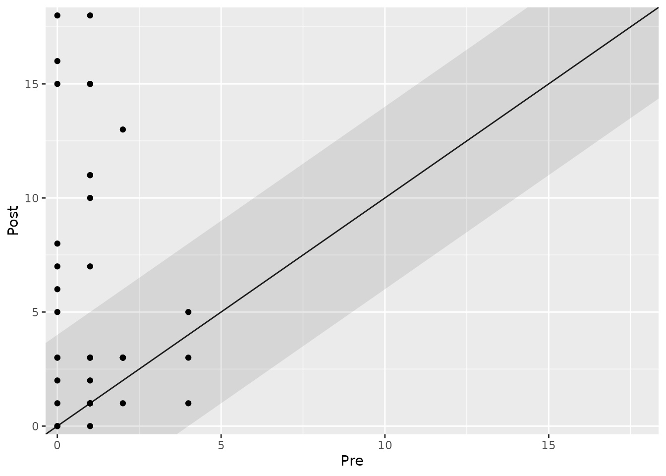 post = pre ± MID. - Points below the shaded area: Clinically significant improvement.