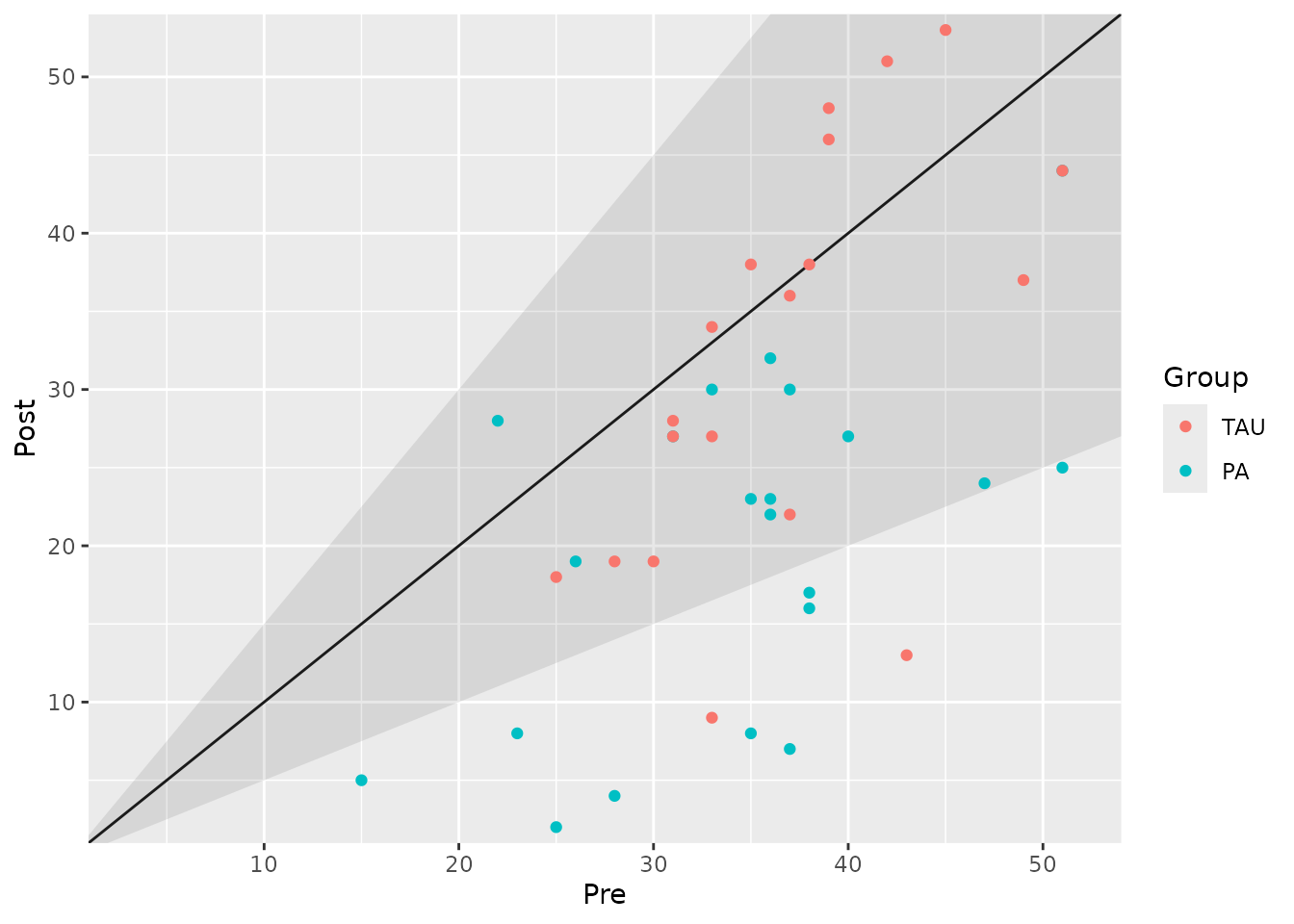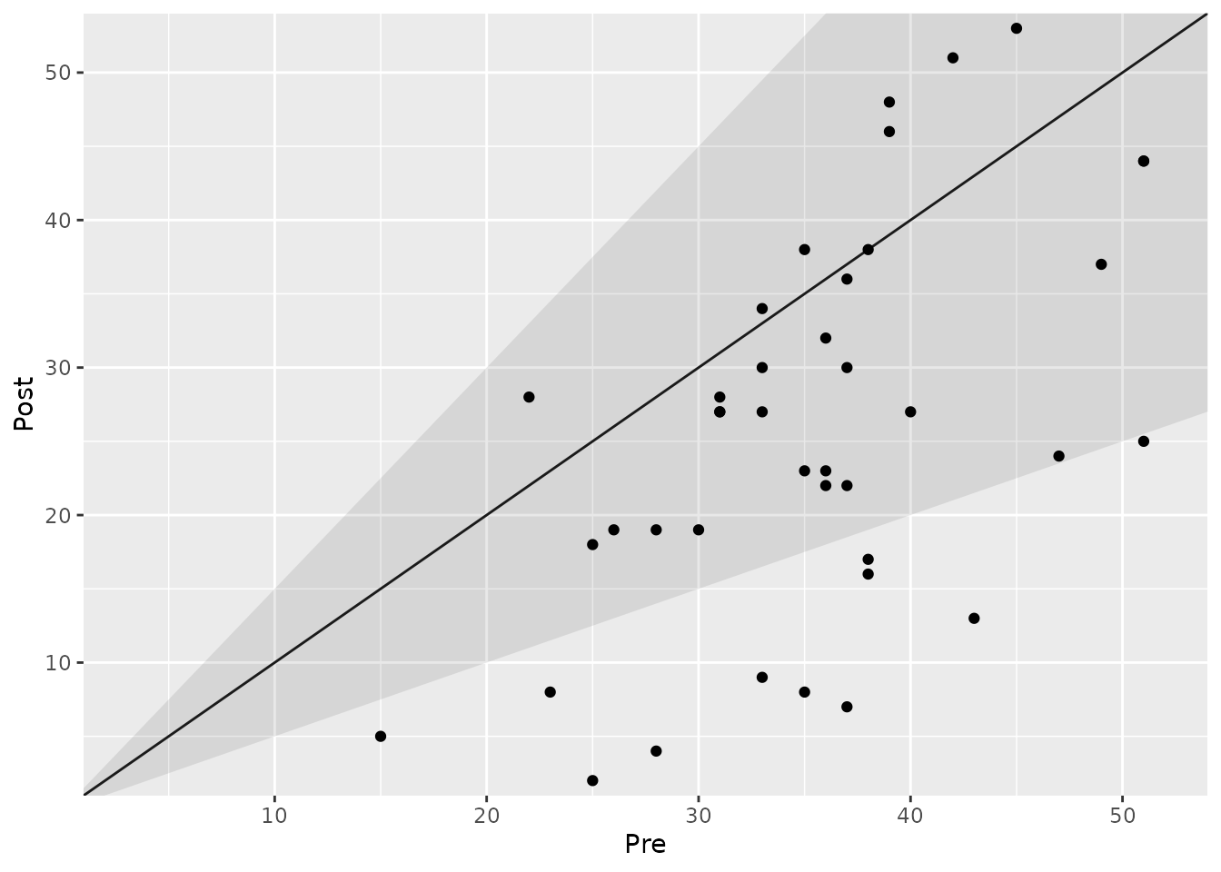 The plot for the percentage-change approach looks similar to those for the anchor- and distribution-based methods. However, the shaded area is now determined by the percentage-change cutoff relative to each individual’s starting score. This means the boundaries of the “unchanged” area are not parallel lines.